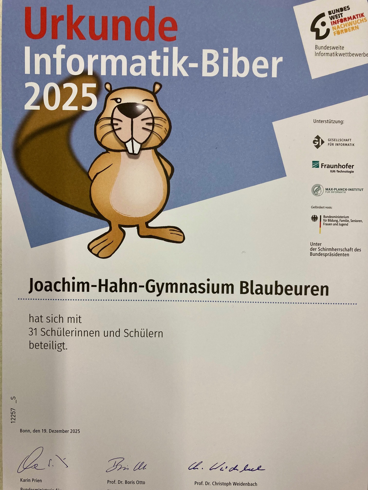 In diesem Schuljahr hat das JHG erstmalig mit 31 Schülerinnen und Schülern am Informatik-Biber teilgenommen. Dabei handelt es sich um den größten Informatik-Wettbewerb in Deutschland, der auch mit insgesamt 580 960 Kindern und Jugendlichen einen neuen Rekord verzeichnen konnte.