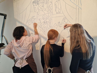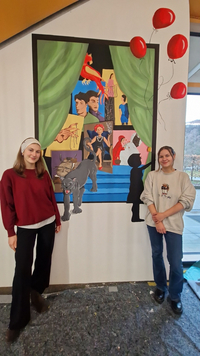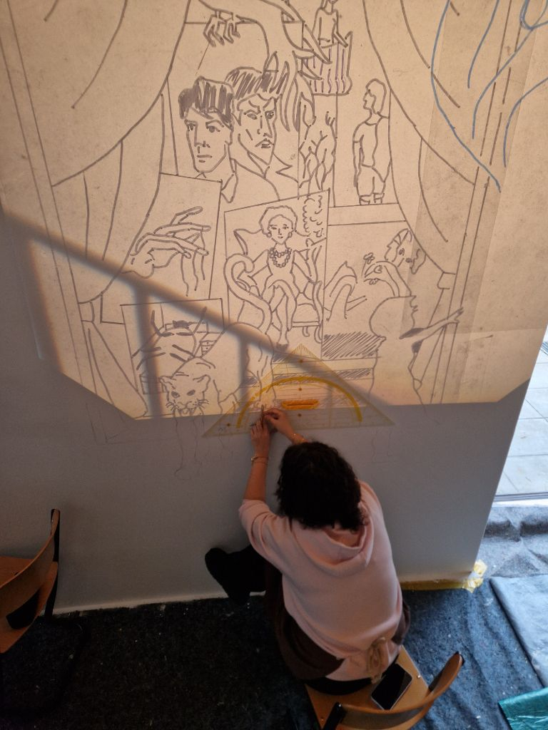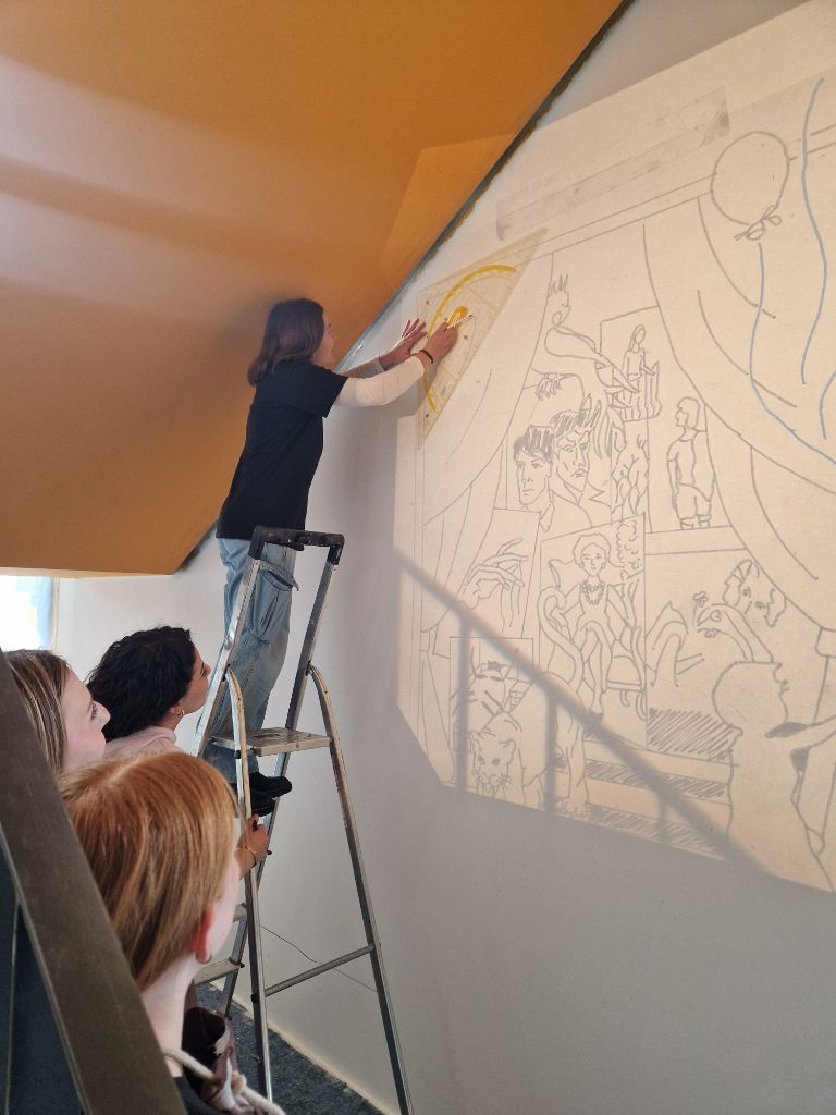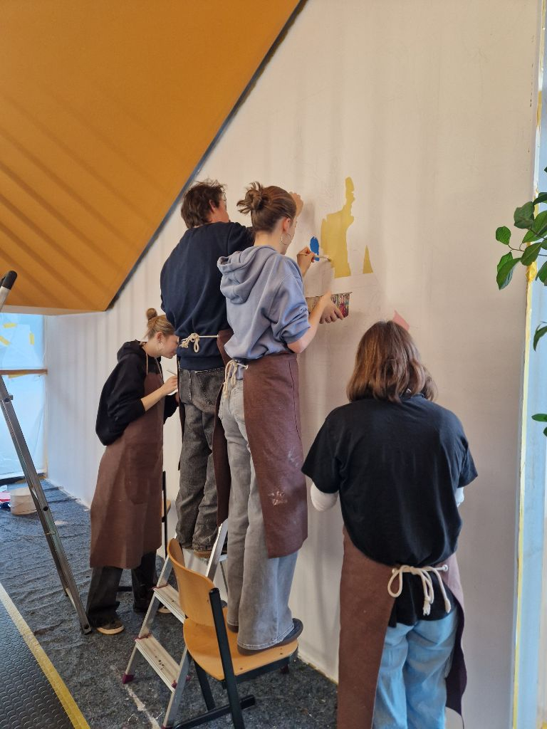 Das Ergebnis des Projekts zeigt sich nun an einer neu gestalteten Wand im Schulhaus: Wie durch einen geöffneten Vorhang blickt man in eine vielschichtige Szene, in der verschiedene literarische Figuren und Motive aufeinandertreffen. Die Darstellung wirkt wie eine Bühne – oder eben wie eine „Tür“ in andere Geschichten. Unterschiedliche Charaktere, Stimmungen und Handlungselemente verschmelzen zu einem Gesamtbild, das beim Betrachten immer neue Details entdecken lässt.