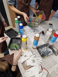 In der Schreibwerkstatt und im Kunstunterricht setzten sich die Schülerinnen und Schüler intensiv mit literarischen Werken auseinander. Dabei entstanden Bilder zu Klassikern wie Kafkas „Der Prozess“, Goethes „Faust“, Shakespeares „Romeo und Julia“ oder Dürrenmatts „Der Besuch der alten Dame“. Auch moderne Werke wie „Corpus Delicti“ sowie Jugendliteratur – etwa aus „Harry Potter und der Orden des Phönix“ – fanden ihren Platz. Für jüngere Klassen wurden zudem Märchen wie „Rotkäppchen“ künstlerisch aufgegriffen.