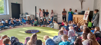 Im Anschluss war es dann endlich soweit: Die Fünftklässler-/innen wurden von ihren Klassenlehrkräften in die neuen Klassenzimmer begleitet. Hier standen Kennenlernspiele auf dem Programm, aber auch der Stundenplan wurde studiert. Nachdem alles Organisatorische erledigt war, fand am ersten Schultag abschließend eine Stunde Fachunterricht statt.