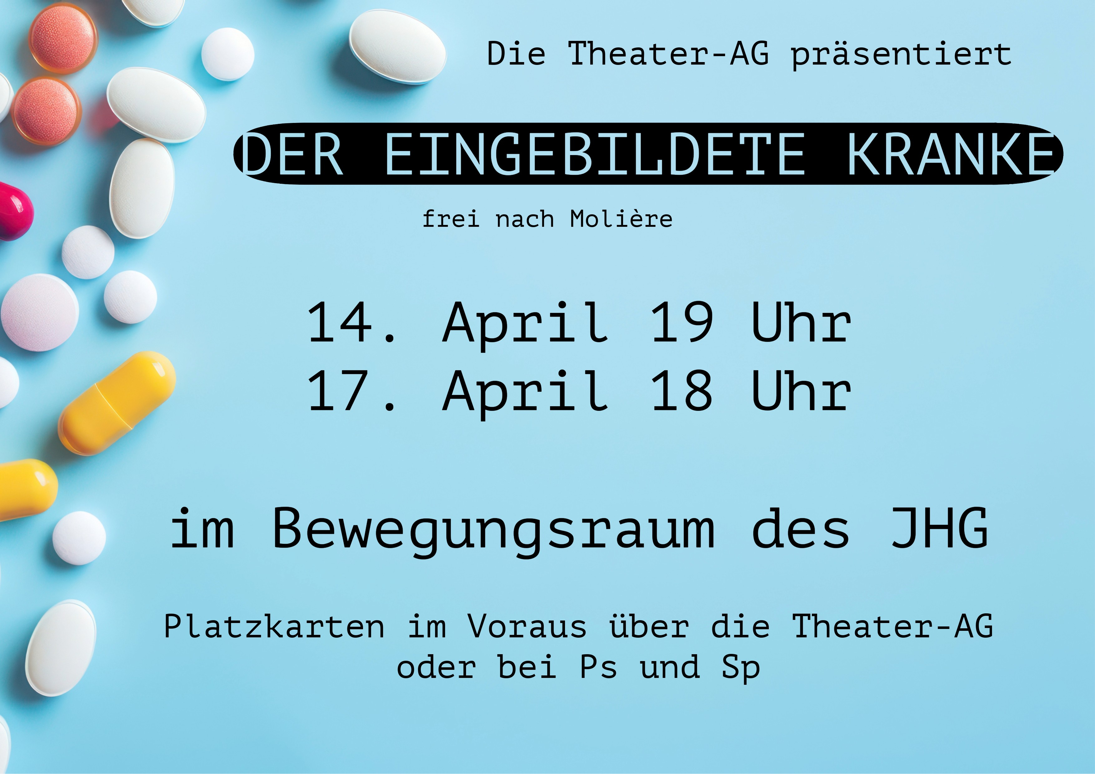 Unsere Theater-AG der Mittelstufe zeigt es Euch auf herrlich witzige Weise: Argan ist so überzeugt von seinen eingebildeten Leiden, dass er jedem noch so fragwürdigen Arzt glaubt – und damit seine ganze Familie ins reinste Chaos stürzt.