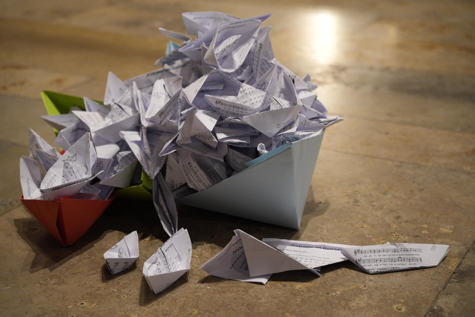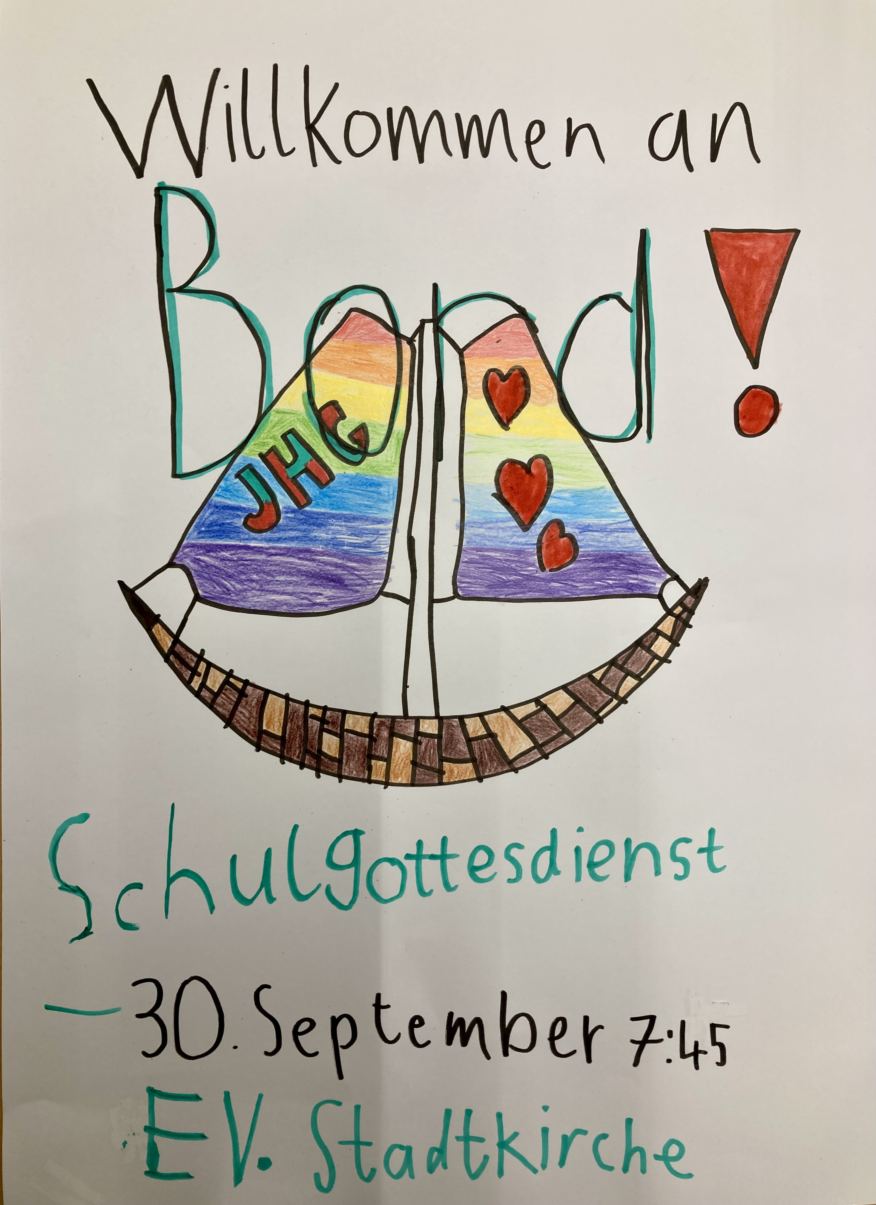 Unter dem Motto "Willkommen an Bord" fand am 30. September der Schulanfangsgottesdienst des Joachim-Hahn-Gymnasiums in der Evangelischen Stadtkirche statt. Traditionell wurden dabei auch besonders die neuen 5er am JHG begrüßt. Die 6er begrüßten mit einem eigens komponierten Lied ihre Nachfolger und wirkten bei den Fürbitten mit. Die 7er trugen Gedanken zum Predigttext der "Sturmstillung" bei. So spürten die neuen 5er gleich, dass sie in vielen und immer größeren Booten willkommen sind: in der Klasse, der Schule, der Familie und im Schiff der weltweiten Gemeinschaft. Dies wurde symbolisch dargestellt durch verschieden große Faltboote. Am Ende des Gottesdienstes falteten alle ihren Liedzettel zu einem Schiff und füllten damit das große Faltschiff (siehe Bild). Später am Tag erhielten dann alle 5er als Geschenk von ihren 12er Paten ein selbstgebasteltes Schiff aus Holz und Bast geschenkt